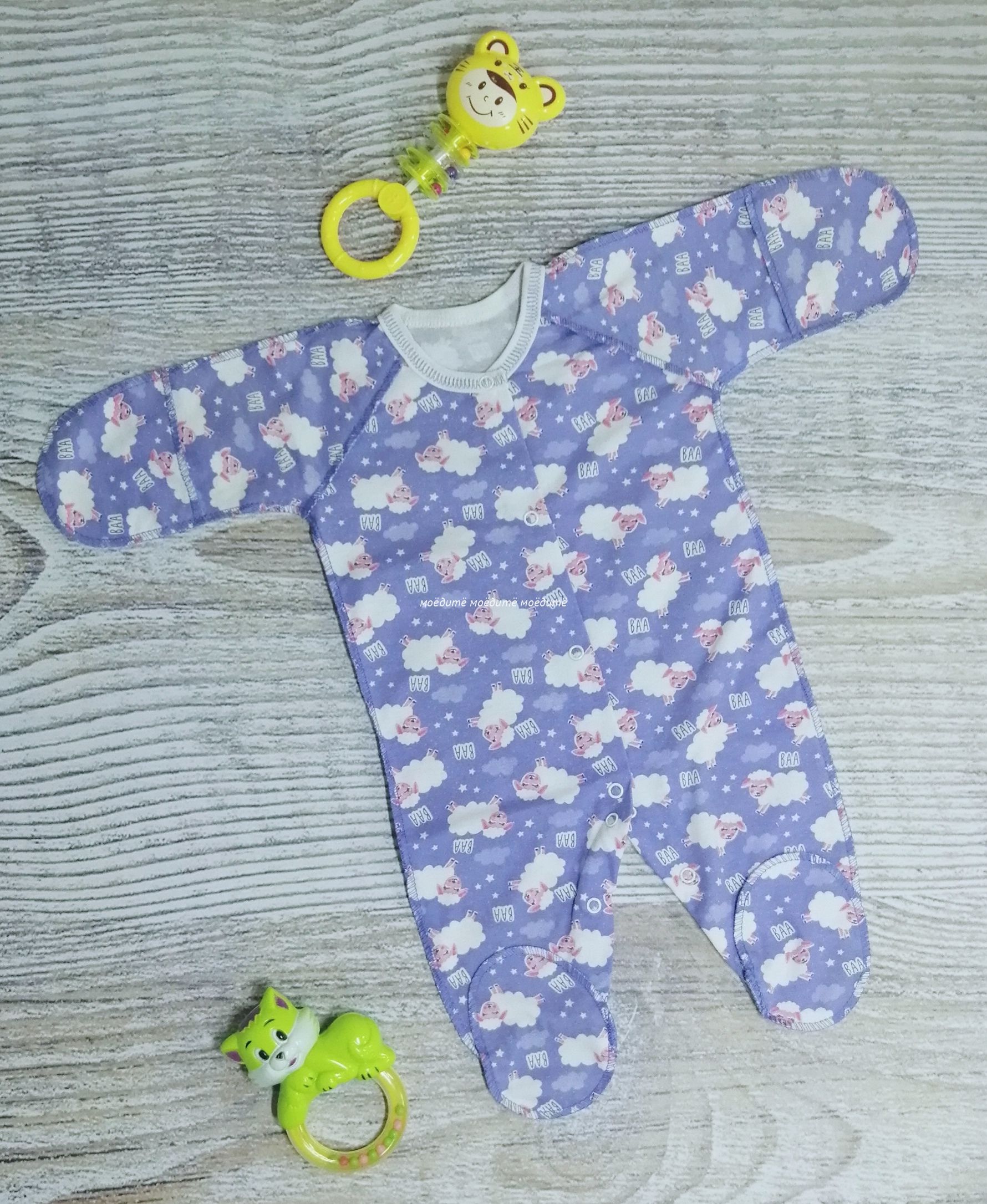 Комбинезон с закрытыми ножками, с рукавчиками-трансформерами, с кнопочками спереди и между ножек, со швами наружу.